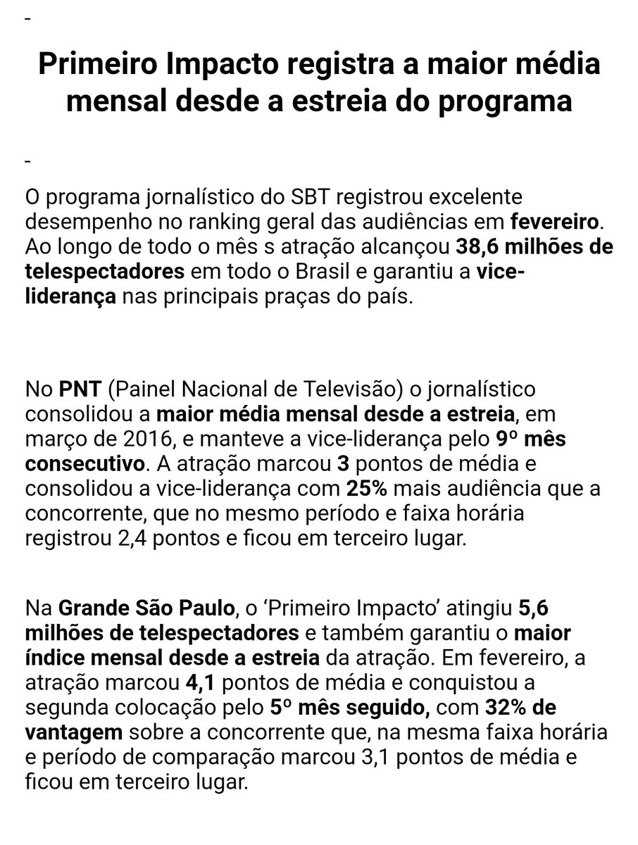 Primeiro Impacto registra a maior média mensal desde a estreia e é vice-líder isolado no PNT